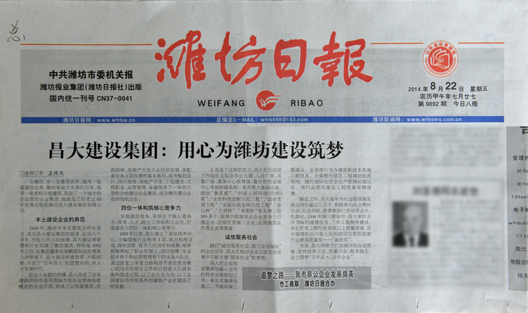 《昌大建設集團——用心為濰坊建設筑夢》——濰坊日報2014年8月22日第二版