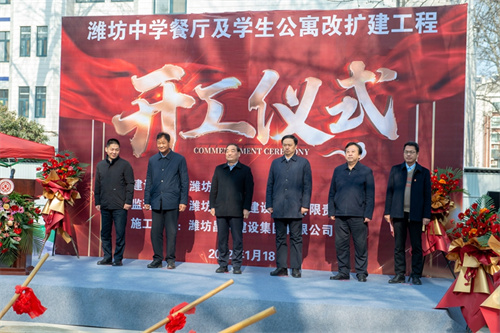 2022年1月18日上午,濰坊中學餐廳及學生公寓改擴建工程開工儀式在項目現場隆重舉行。集團總裁朱九洲,副總裁孟憲禮出席開工儀式。出席開工儀式的領導和嘉賓還有:濰坊市委教育工委副書記、市教育局黨組書記、局長杜全平,奎文區委副書記李慶華,市教育局副局長井光進,市工程建設監理公司董事長曹金采,濰坊中學黨委書記、校長趙洪東等。建設單位、監理單位,集團二建公司、安裝公司等相關單位負責同志及員工代表參加活動。