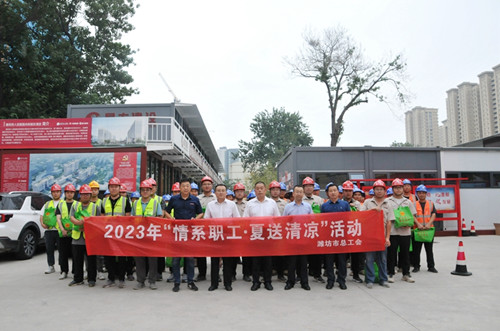 2023年7月12日上午,濰坊市總工會副主席朱建平到集團總承包施工的市重點項目濰坊市人民醫院項目現場進行了“情系職工?夏送清涼”走訪慰問活動,向廣大一線建設者表示慰問,并為一建公司、四建公司一線職工發放清涼物資包(天堂折疊傘、日照綠茶、六神花露水、奇強洗衣粉、舒蕾沐浴露、潔玉毛巾等)。