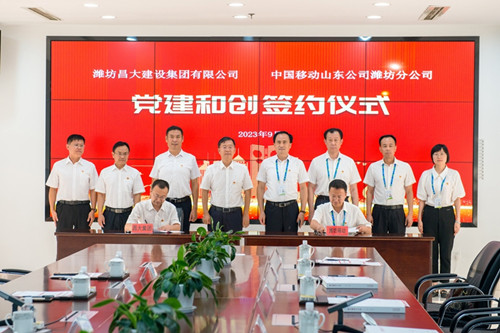 2023年9月13日下午,濰坊昌大建設集團與中國移動山東公司濰坊分公司“黨建和創”戰略合作協議簽約儀式在濰坊移動總部辦公樓舉行。集團公司黨委書記、董事長徐鵬強,濰坊移動黨委書記、總經理李亞平出席簽約儀式。集團公司紀委書記穆乃杰與濰坊移動黨委委員、工會主席、副總經理李廣代表雙方在協議書上簽字。