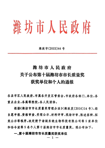 2023年11月27日,濰坊市人民政府公布了第十屆濰坊市市長質量獎獲獎名單,根據《濰坊市市長質量獎管理辦法》(濰政發〔2016〕14號),經自愿申報、資格審查、受理公示、材料評審、現場評審、陳述答辯、擬獎公示等程序,集團公司榮獲第十屆濰坊市市長質量獎。