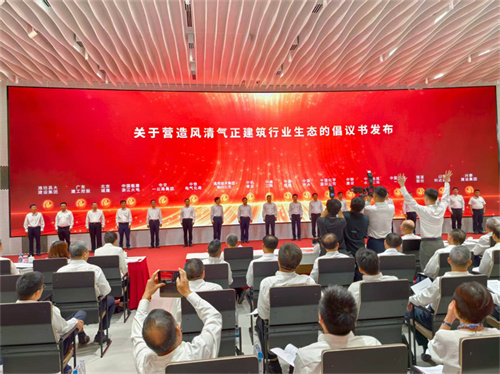 會(huì)議播放了建筑行業(yè)發(fā)展成果視頻《基石之力筑夢中國式現(xiàn)代化》;中國建筑董事長、黨組書記鄭學(xué)選進(jìn)行了主旨發(fā)言;倡議發(fā)起單位代表中鐵二局黨委副書記、總經(jīng)理張兵,中核集團(tuán)副總工程師、中國核建黨委書記、董事長陳寶珠,上海建工集團(tuán)黨委副書記、工會(huì)主席殷紅霞,濰坊昌大建設(shè)集團(tuán)董事長徐鵬強(qiáng)分別進(jìn)行了表態(tài)發(fā)言;中建一局黨委書記、董事長左強(qiáng)代表建筑企業(yè)宣讀了倡議書,中建二局、中國核建、中機(jī)建設(shè)、中國中冶、通用技術(shù)集團(tuán)新興公司、中國化學(xué)國際公司、中鐵電氣化局、中鐵建設(shè)、中交一公局集團(tuán)、中國電建水電七局、中國能建浙江火電、中國安能一局、北京城建、隧道股份、廣東建工控股、山東科達(dá)集團(tuán)、濰坊昌大建設(shè)集團(tuán)、興泰建設(shè)集團(tuán)領(lǐng)導(dǎo),共同按壓大屏手印圖案,聯(lián)合發(fā)布了《關(guān)于號(hào)召建筑行業(yè)黨組織和廣大黨員在營造風(fēng)清氣正行業(yè)環(huán)境中走在前作表率的倡議書》。